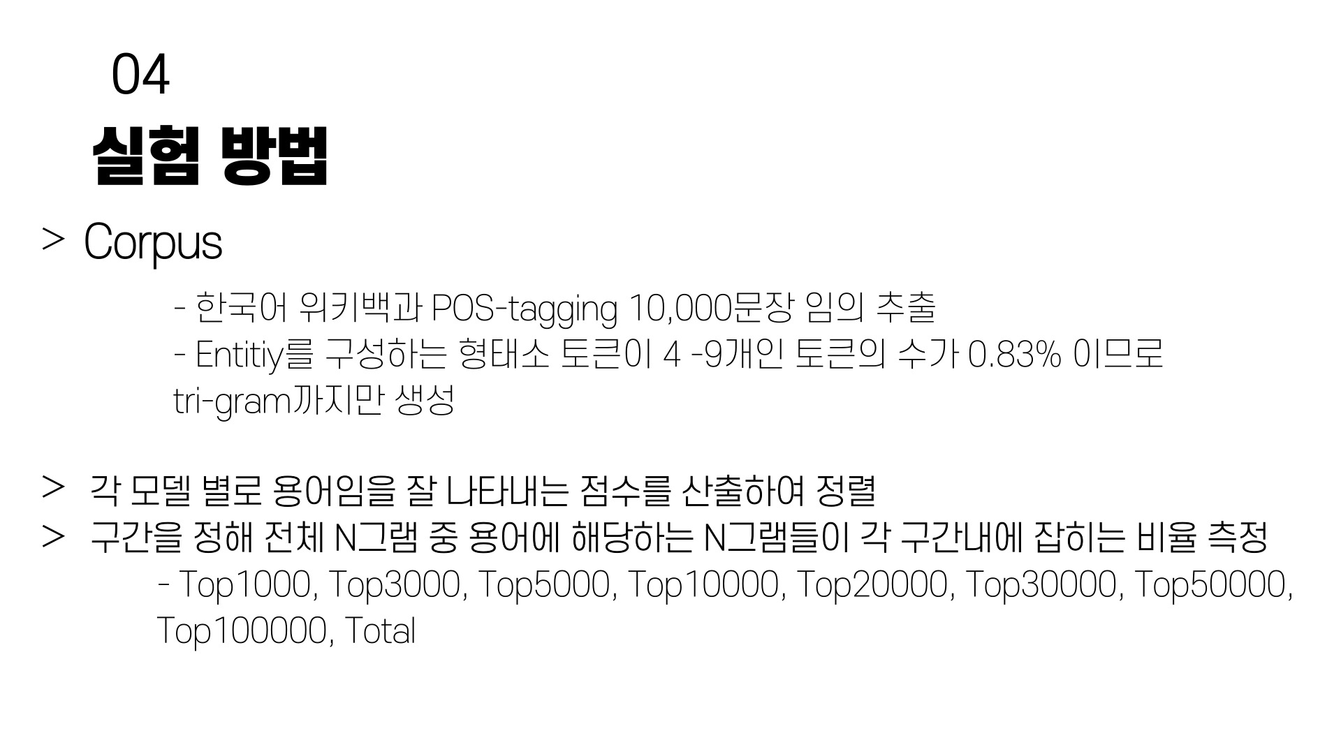 실험에 사용할 코퍼스는 한국어 위키백과에서 10,000문장 임의 추출한다. 문장 내 일부 단어들은 사람이름, 장소, 기관등으로 Entity태깅이 되어 있고, 형태소 단위로 토큰화 되어있다. Entity태깅된 단어들은 1-9개의 토큰으로 구성되는데 토큰이 4-9로 구성된 것은 전체의 0.83%밖에 되지 않기 때문에 불필요한 계산을 피하기 위해 tri-gram까지만 생성한다. 소수인 것은 그냥 무시한다는 말이다. 각 모델별로 용어임을 잘 나타내는 점수를 산출하여 정렬하여 구간을 정해 전체 N그램 중 용어에 해당하는 N그램들이 각 구간내에 잡히는 비율을 측정한다.