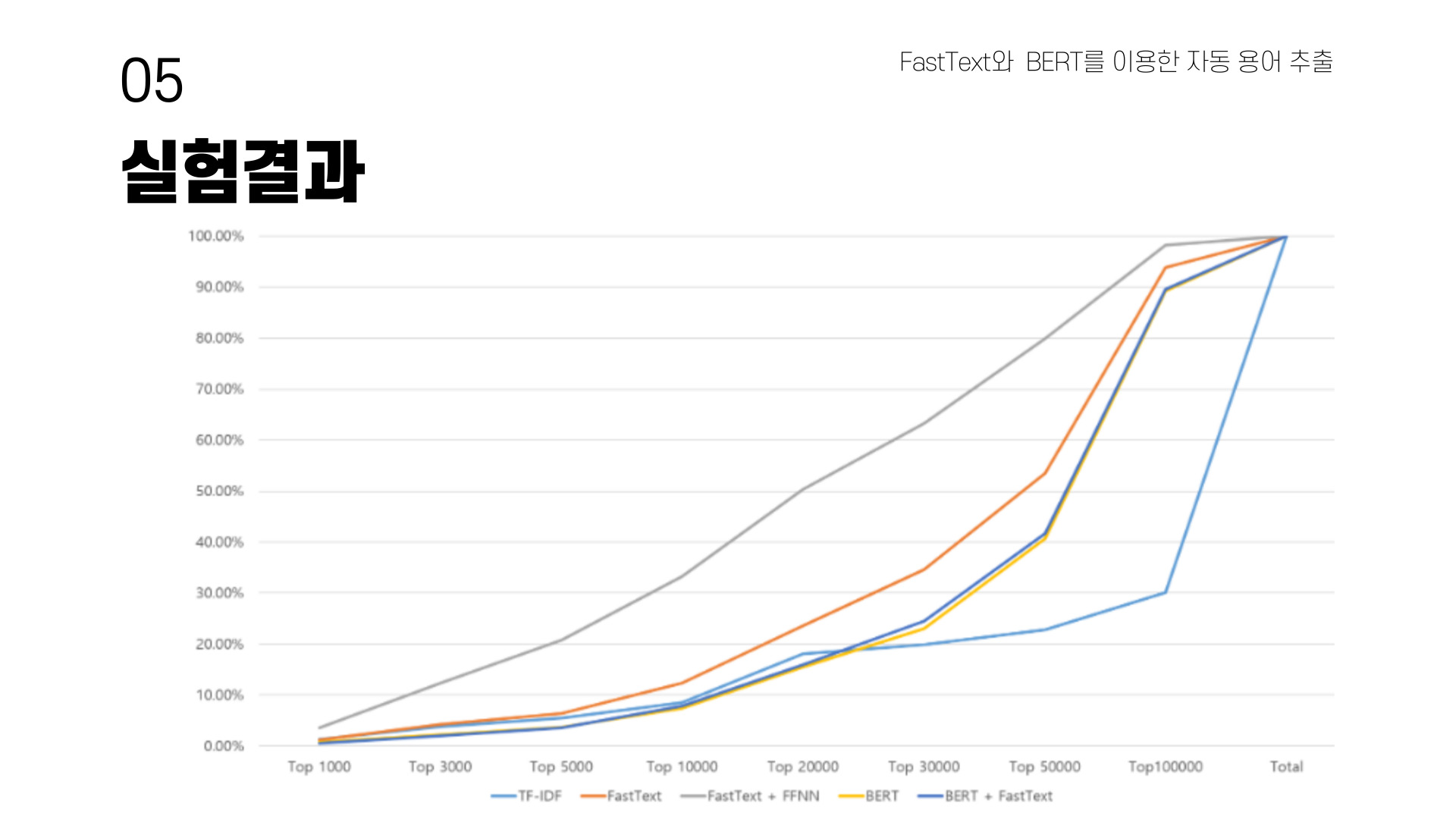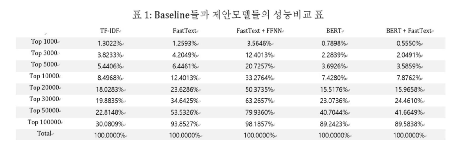 이진 분류기가 붙은 모델이 가장 좋은 성능을 나타내며 BERT와 FastText융합 모델은 top 10000까지 좋은 성능을 보이다가 다른 모델에 역정당하는 것을 알 수 있다.