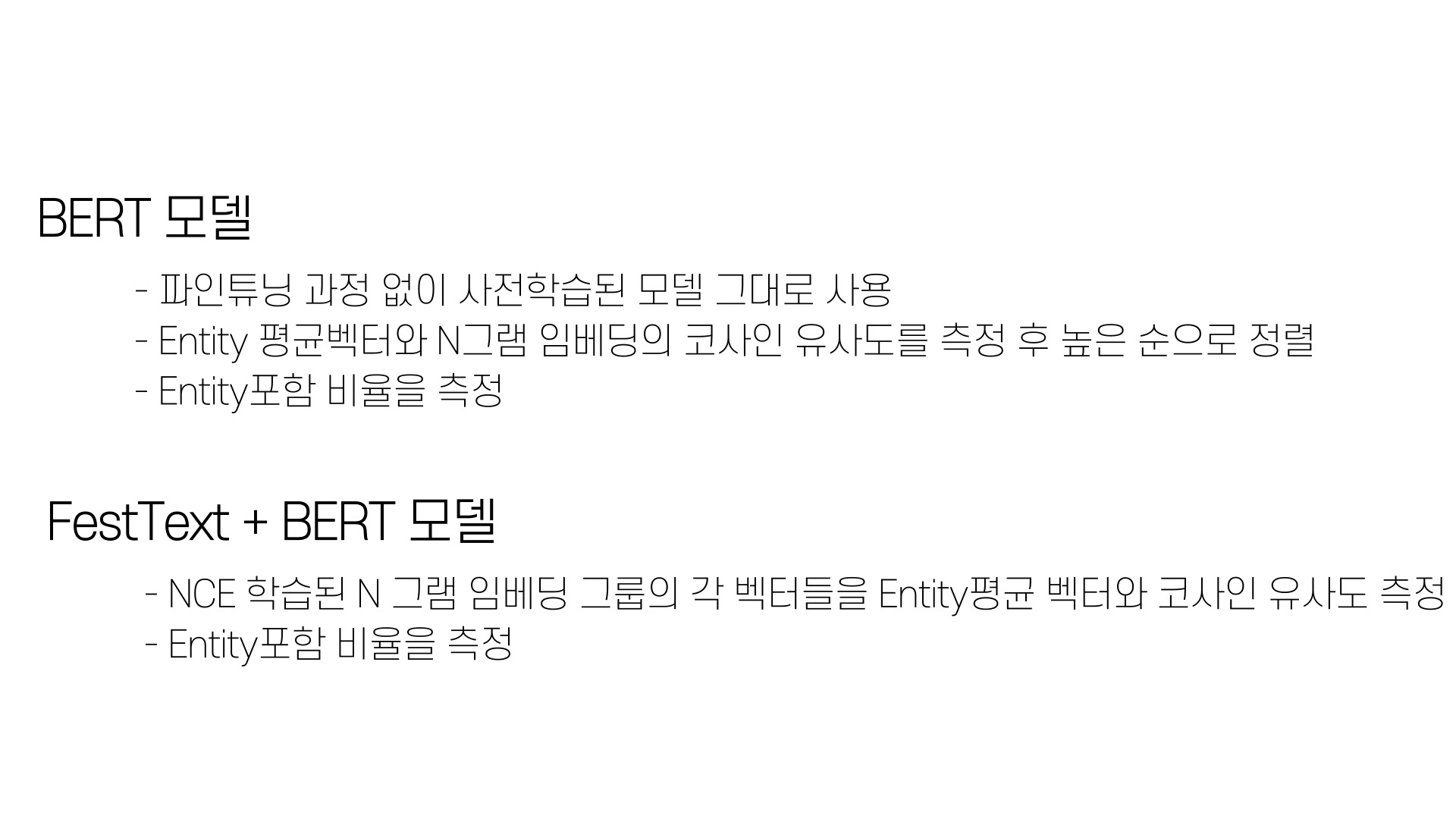 BERT모델은 파인 튜닝 과정 없이 사전학습된 모델을 그대로 사용하고, Entity평균 벡터와 N그램 임베딩의 코사인 유사도를 측정해 높은 순으로 정렬한다.