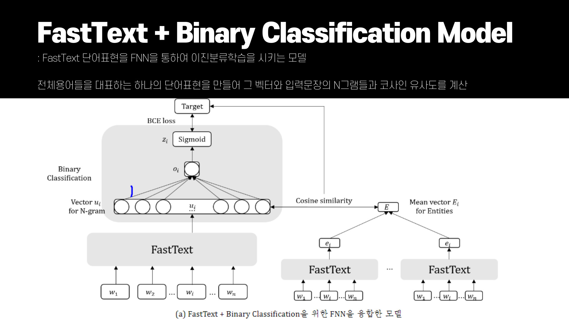 먼저 FastText에 이진분류기를 얹은 모델이다. 주어진 코퍼스의 문장들은 (s = {w1, w2, ..., wn}) N그램 또는 Entity셋으로 구성되어 있고, Entity셋은 추출한 용어의 특성을 나타내줄 정답 레이블에 해당한다. 모든 Entity에 대한 단어 표현인 ei를 추출하고 모든 Entity를 대표하는 E를 구한다.