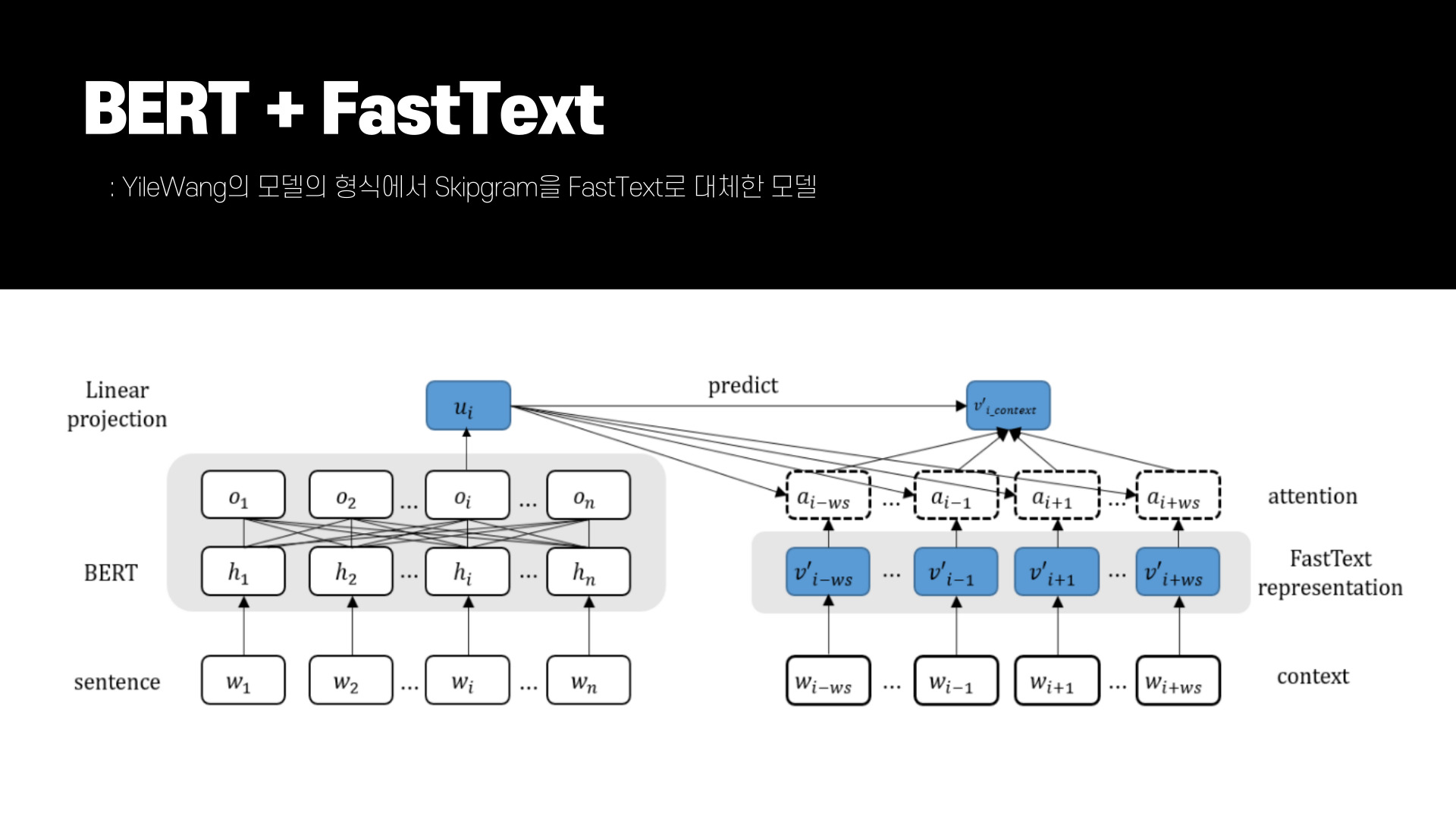 두번째 모델은 Yile Wang의 모델에서 skip-gram을 FastText로 바꾼 모델이다. FastText에서 활용할 중심 단어의 단어 표현 ui를 BERT를 사용해 추출한다. FastText는 BERT에서 추출한 중심단어의 주변단어들(W_i-ws, ..., W_i+ws)의 단어 표현(v_i-ws, ..., v_i+ws)들을 추출하여 attention distribution을 계산한다.