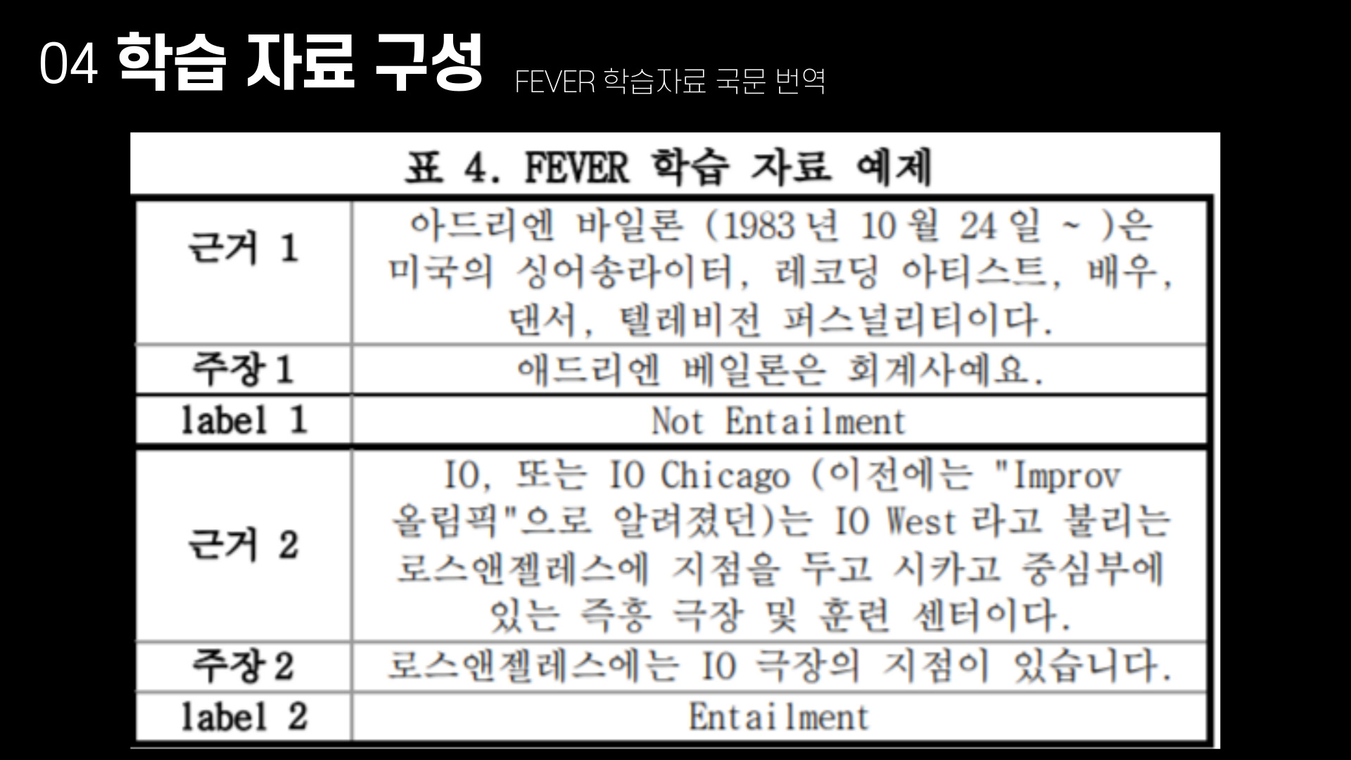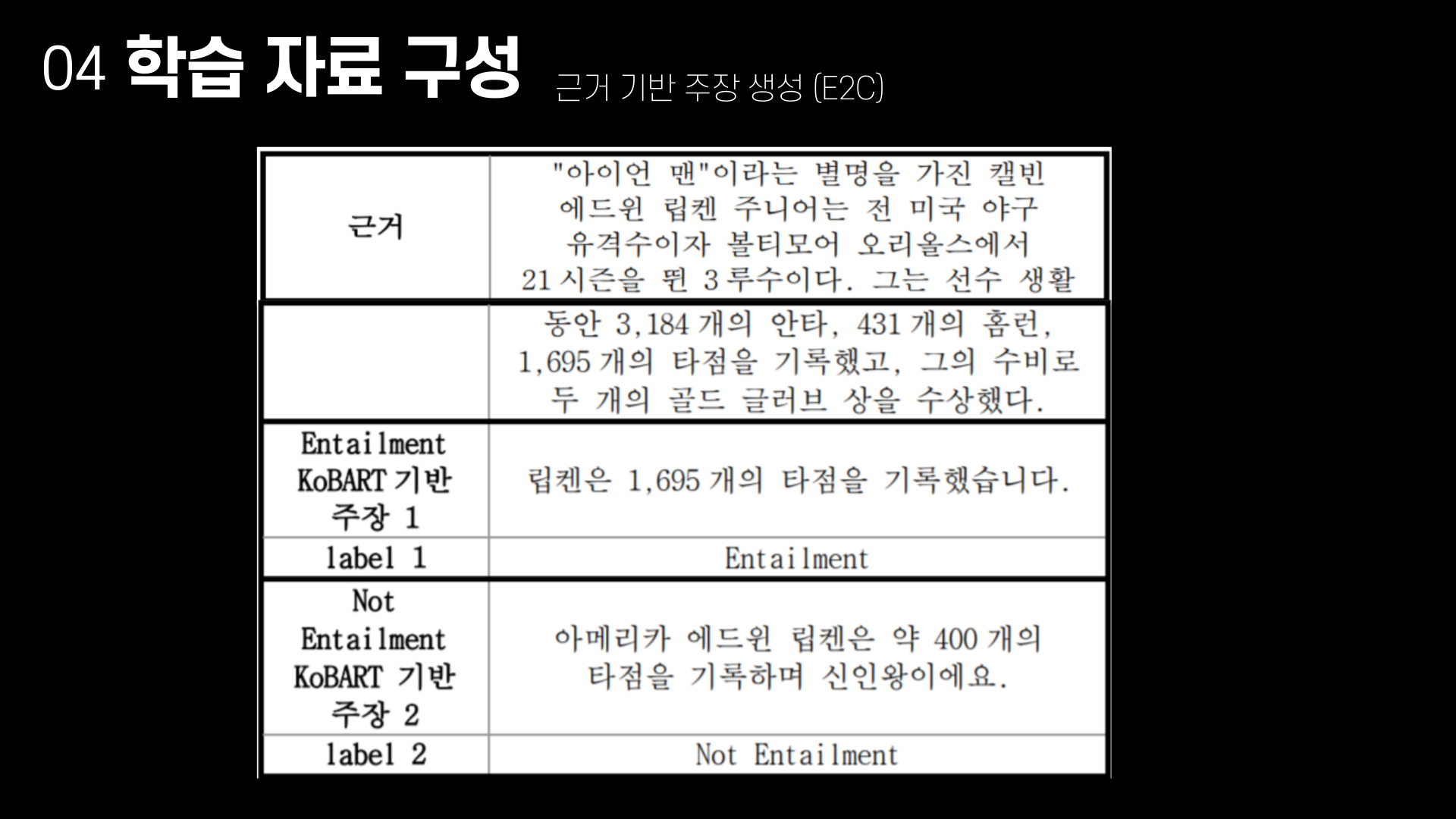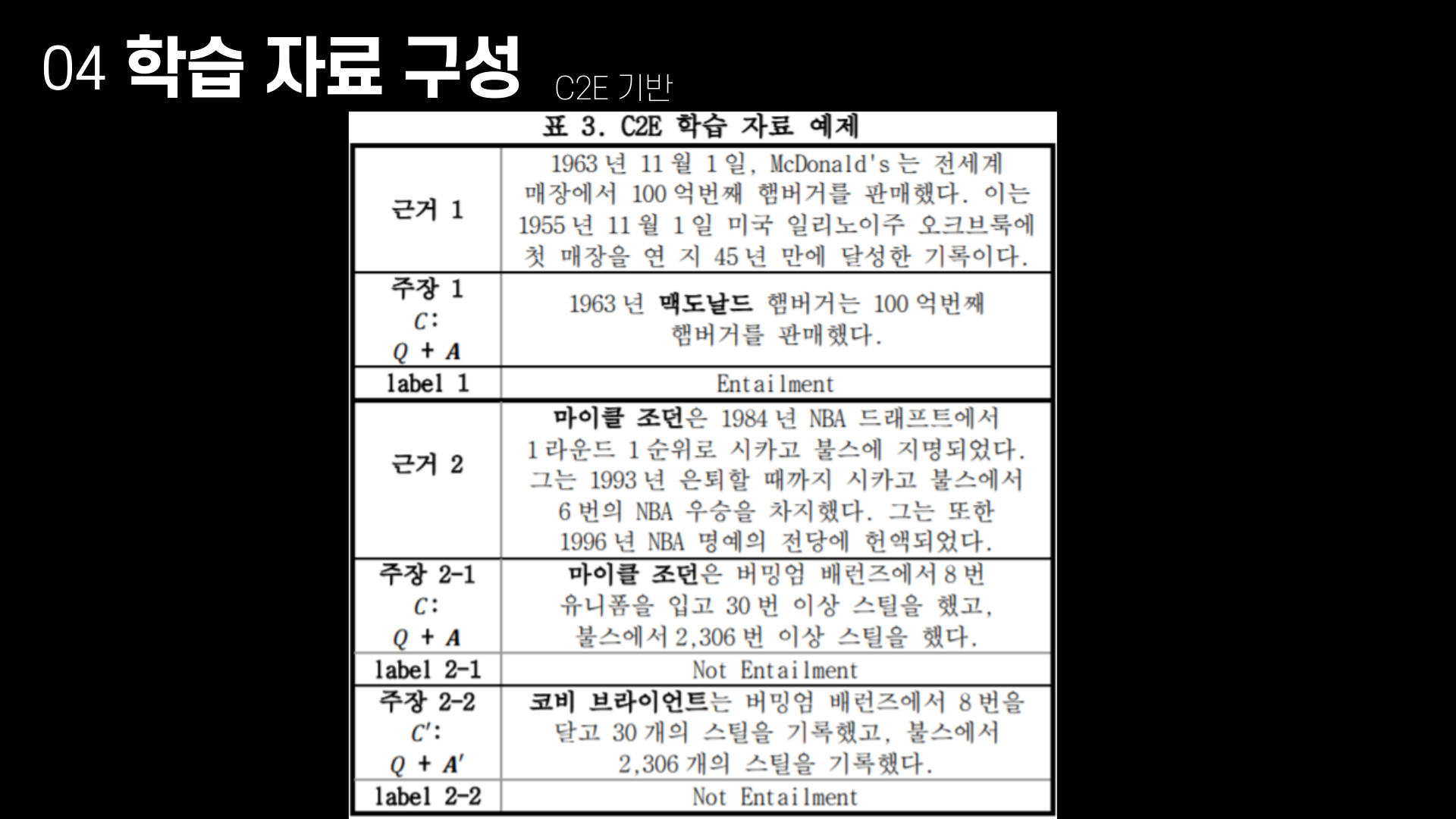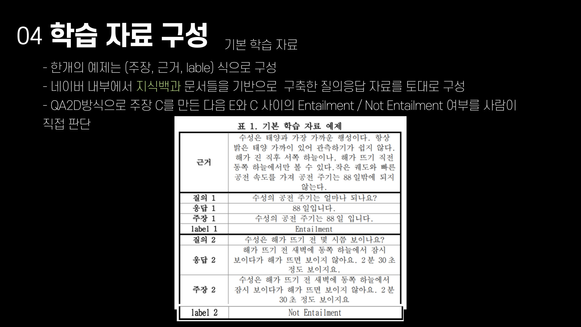한 개의 예제는 (주장, 근거, lable)식으로 구성된다. 기본 학습 자료는 네이버 내부에서 지식백과 문서들을 기반으로 구축한 질의응답 자료를 토대로 구성된다. 질의응답 자료 내의 예제로 근거 E, 질의 Q, 응답 A가 주어지면 QA2D방식으로 질의Q와 응답 A를 기반으로 하는 주장 C를 만드 다음, 근거 E와 주장 C사이의 Entailment/Not Entailment 여부를 사람이 직접 판단하였다.