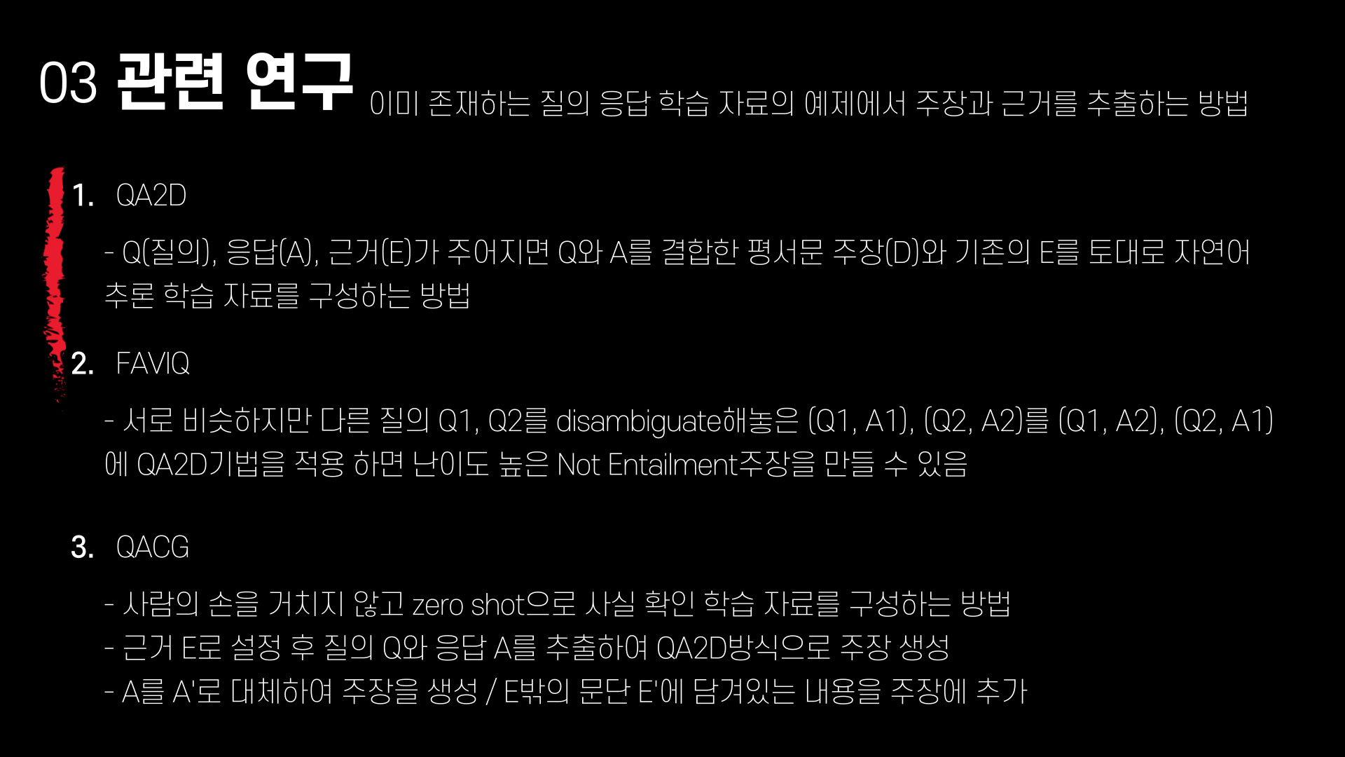 질의, 응답, 근거가 주어지면 질의와 응답을 결합한 평서문 주장(Declarative Claim)과 기존의 근거를 토대로 자연어 추론 학습자룔르 구성하는 방법이다.