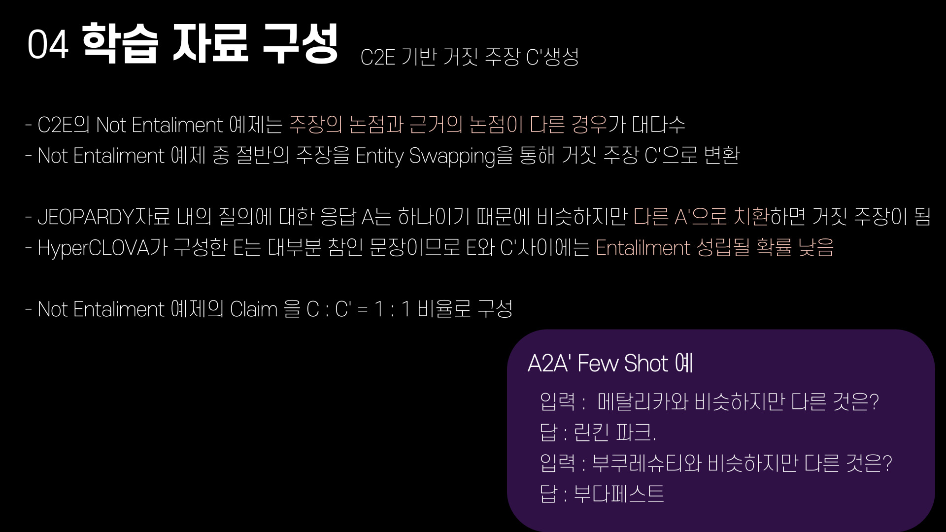 C2E의 Not Entailment 예제는 주장의 논점과 근거의논점이 다른 경우가 대다수이기 때문에 주장과 근거가 서로 상충하는 예제는 자연스럽게 생성될 수 없다. 따라서 이 논문은 Not Entailment 예제 중 절반의 주장을 Entity Swapping을 통해 거짓 주장 $$C'$$ 으로 변환한다. JEOPARDY 자료내의 질의 $$Q$$에 대한 적절한 응답 $$A$$는 하나이기 때문에, $$A$$를 비슷하지만 다른 응답 $$A'$$로 치환 할 때 $$Q$$와 $$A'$$로 구성된 주장 $$C'$$은 거짓인 주장이 된다. 질의 $$Q$$와 응답 $$A$$를 기반으로 HyperCLOVA가 구성한 근거 $$E$$는 대부분 참인 문장이니, $$E$$와 $$C'$$사이에는 Entailment 관계가 성립될 확률이 매우 낮다.