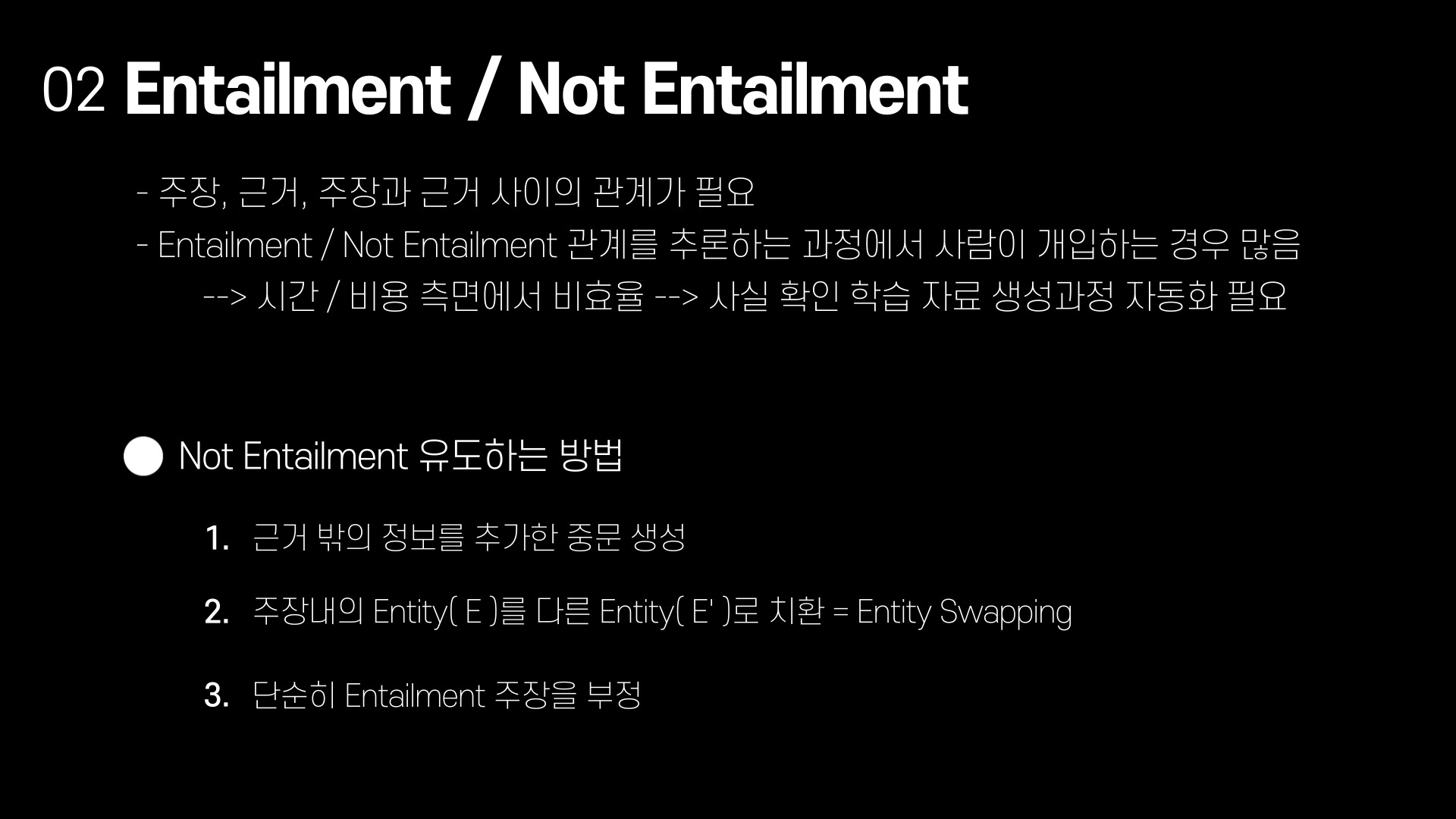 Entailment 예제의 경우, 사실 기반의 문서 문단을 근거로 삼은 뒤, 근거의 내용 중 일부를 취합하여 주장을 형상하는 방식으로 만들 수 있다. 그러나 근거와 Not Entailment관계를 띄는 주장을 만드는 과정은 근거 외부의 정보가 추가적으로 필요하다. Not Entailment를 유도하는 방법으로는 세가지 방법이 있다.