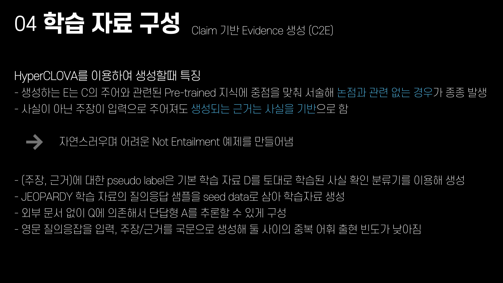 HyperCLOVA가 출력한 (주장, 근거)에 대한 pseudo label은 기본 학습 자료 d를 토대로 학습된 사실 확인 분류기를 이용하여 생성한다. 이 논문은 인터넷 상에 공개된 JEOPARDY 학습 자료의 질의응답 샘플을 Seed data로 삼아 학습 자료를 생성하였다. JEOPARDY의 질의 내부에 HyperCLOVA가 근거 생성 시 참고할 만한 정보가 충분히 압축되어 있어 외부 문서 없이 질의에 의존해서 단답형 응답을 추론 할 수 있다. JEOPARDY는 영문으로 되어있어 HyperCLOVA에게 영문 질의 응답을 입력해주고 그에 대한 주장과 근거를 국문으로 생성할 때 둘 사이의 중복 어휘 출현 빈도를 낮출 수 있다. 이에 따라 좋은 품질과 난이도를 가진 데이터를 구축 할 수 있다.