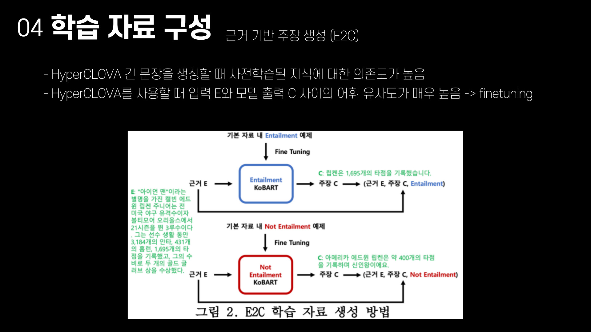 자연어 생성 모델로 HyperCLOVA를 사용했을 때, 입력 근거와 모델이 출력한 주장 사이의 어휘 유사도가 매우 높게 측정되었다. 이는 사실 확인 과제에 유용한 샘플이 되지 못한다고 판단하여, KoBART를 각 Entailment/Not Entailment label에 해당하는 기본 학습 자료 내 예제에 파인 튜닝(finetuning)하여 사용해 입력 근거와 생성 주장의 어휘 유사도를 낮춘다.