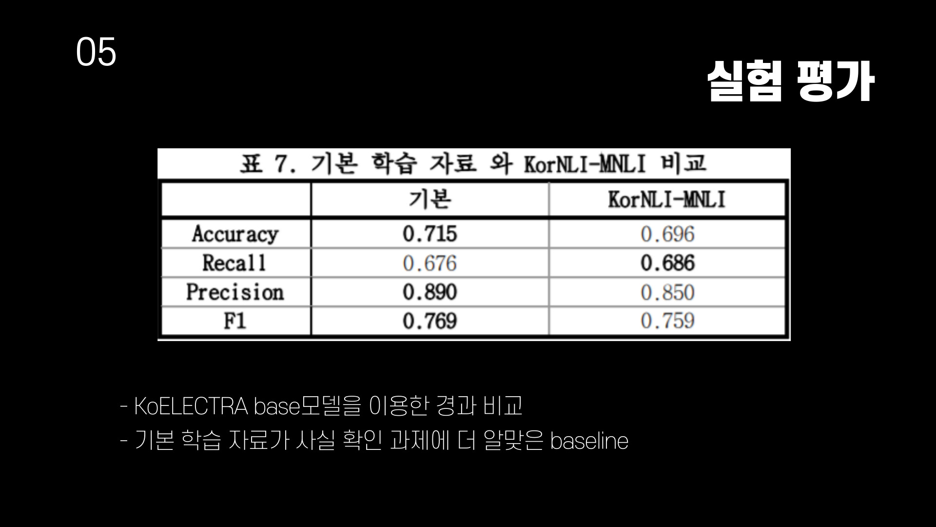 Baseline이 될 기본 학습 자료의 품질을 평가하기 위해, 기본 학습 자료를 토대로 학습된 KoELECTRA base 모델과 KorNLI의 MNLI를 토대로 학습한 KoELECTRA base 모델의, 성능을 비교한다. 실험 결과, 기본 학습 자료의 크기는 KorNLI-MNLI 자료 크기의 5.4%에 불과하지만, 평가 자료에 대해서 더 놓은 정확성과 F1을 보여준다. 이는 기본 학습 자료가 사실 확인 과제에 더 알맞은 Baseline임을 보여준다.