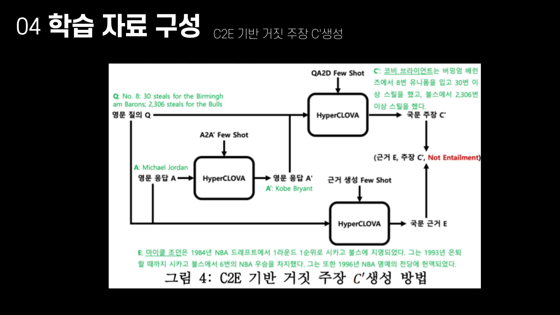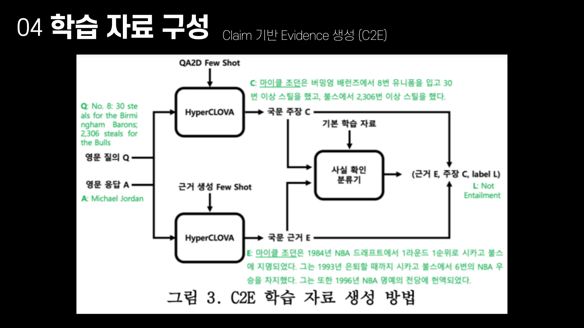 C2E방식은 우선 JEOPARDY 내의 질의와 응답을 QA2D 방식으로 병합하여 주장을 생성한다. 질의와 응답의 연관성을 설명하는 "근거 생성 Few shot"을 입력 받은 HyperCLOVA는 질의와 응답 사이의 상관관계를 설명하는 근거를 생성한다. 주장과 근거 사이의 Entailment 여부에 대한 pseudo-label은 기본 학습 자료로 학습된 Larva Large 모델의 사실 확인 분류기로 생성한다.