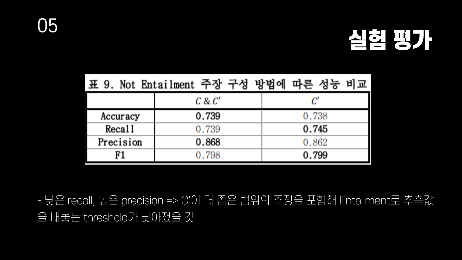 기존 C2E방식은 Not Entailment 주장의 절반을 정답 $$A$$를 기반으로 한 주장 $$C$$, 나머지 절반은 틀린 답 $$A'$$을 기반으로 한 $$C'$$로 구성한다 ($$C&C'$$). Not Entailment 주장을 전부 $$C'$$로 구성했을때 $$C&C'$$기반 모델 성능보다 높은 Recall과 낮은 Precision을 기록한다. 이는 $$C'$$이 $$C&C'$$보다 더 좁은 범위의 주장을 포하하기 때문에, $$C'$$ 기반 사실 확인 분류기는 Entailment로 추측값을 내놓는 경계값(threshold)가 기존 $$C&C'$$ 기반 분류기보다 낮아졌을 것으로 보인다.