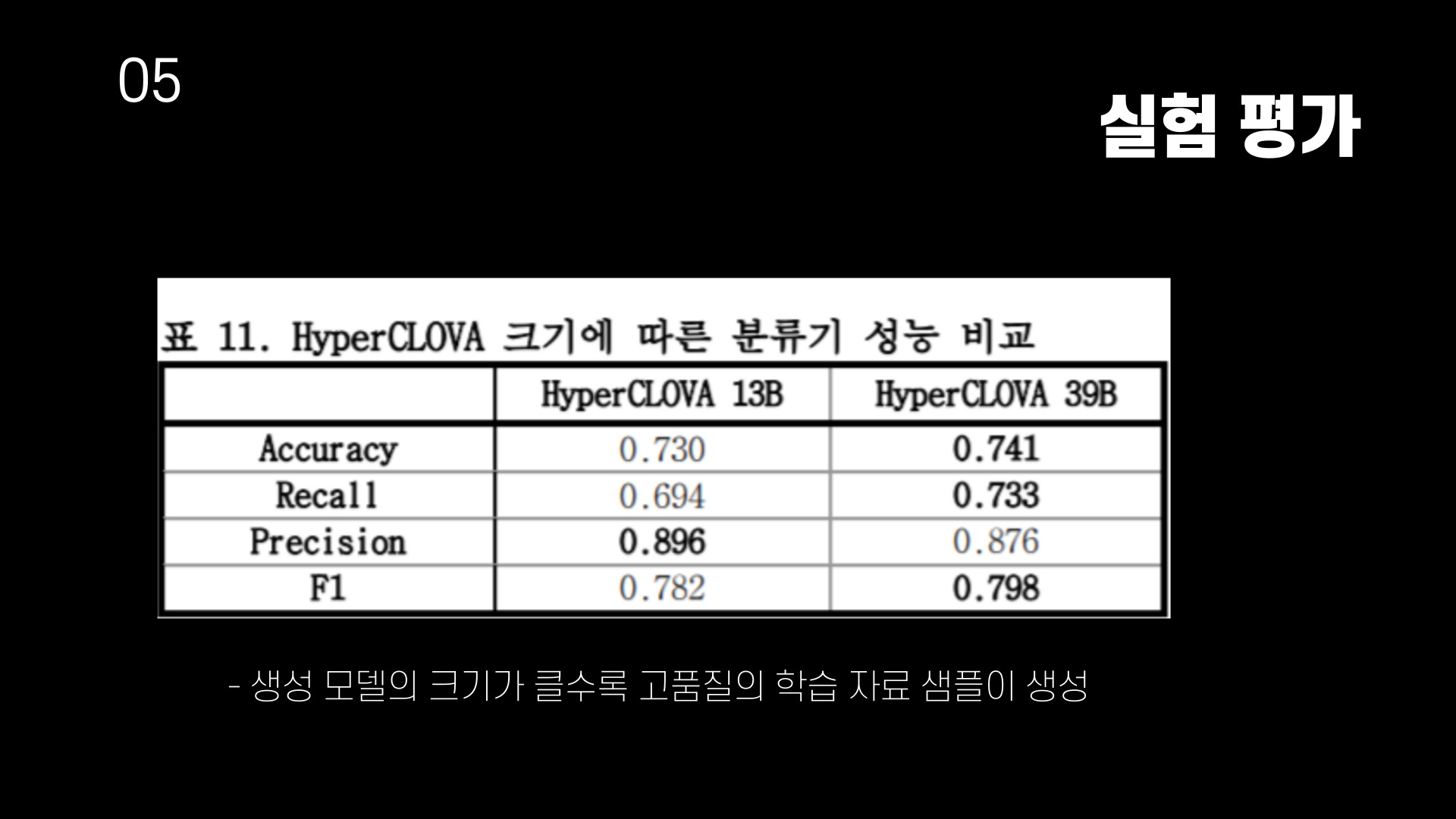 크기가 큰 모델이 더 높은 성능을 기록하는 것을 볼 수 있는데, 이는 생성 모델의 크기가 클수록 고품질의 학습 자료 샘플이 생성되는 것을 의미한다.