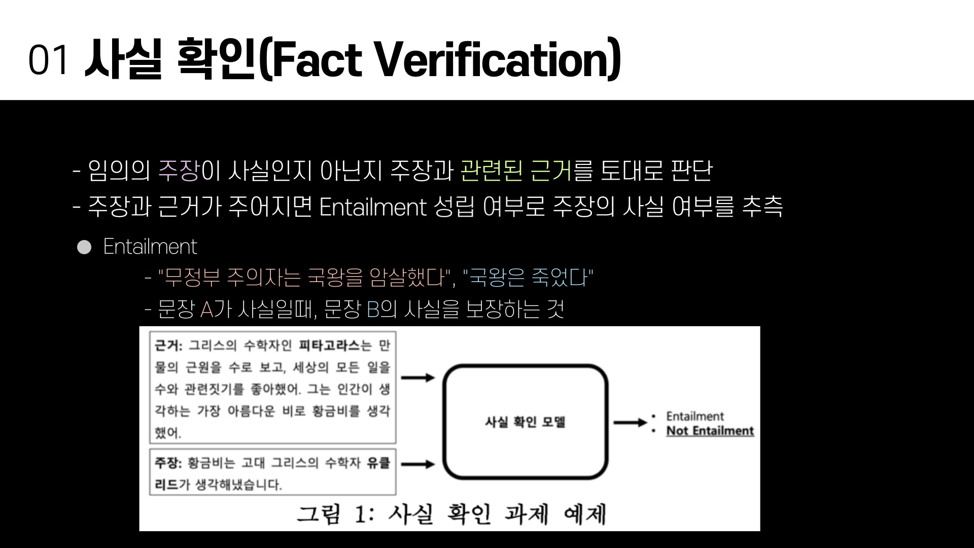 사실 확인이란 임의의 주장이 사실인지 아닌지를 주장과 관련된 근거를 토대로 판단하는 자연어 처리 태스크이다. 사실 확인은 주장과 주장의 논점과 관련된 근거가 주어지면 그 둘 사이에서의 Entailment(함의) 성립 여부로 주장의 사실 여부를 추측한다. Entailment란 예를 들어 "무정부 주의자는 국왕을 암살했다"가 사실일때, "국왕은 죽었다"는 반드시 사실임을 보장하는 관계를 말한다.