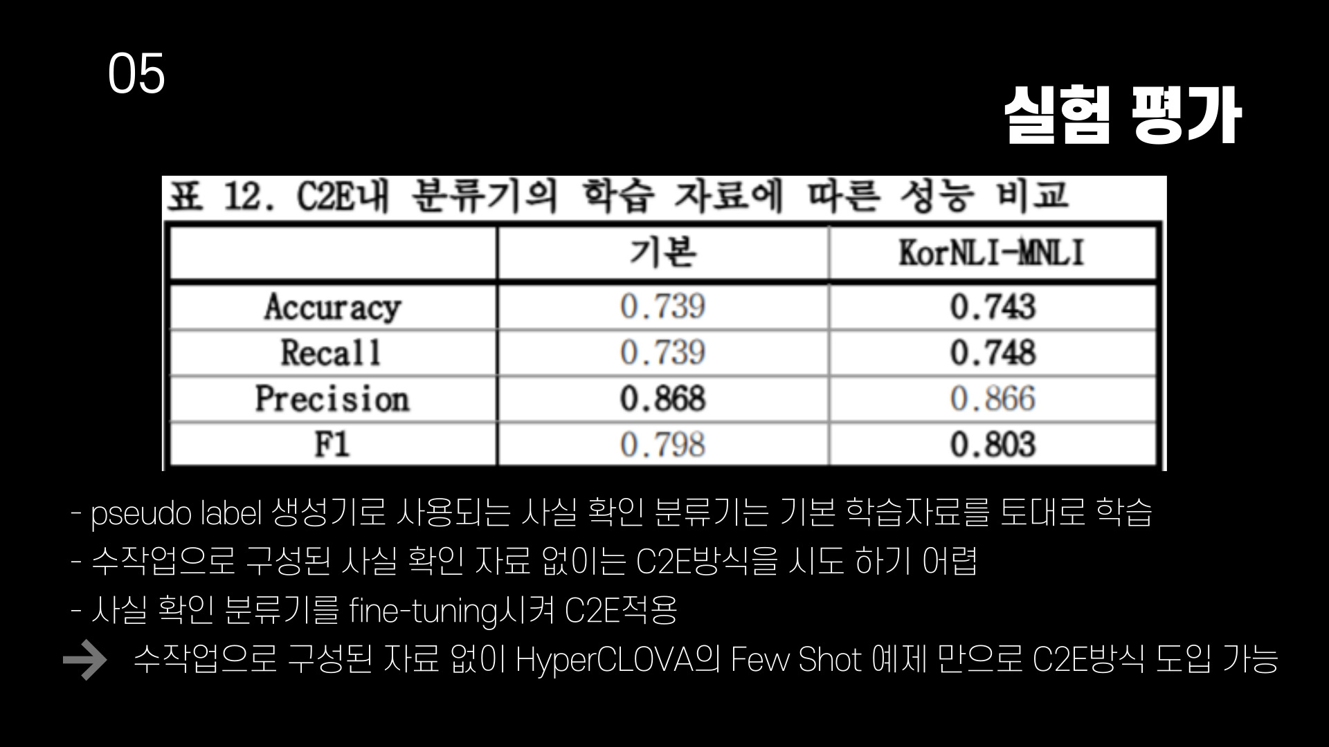 C2E방식의 pseudo label 생성기로 사용되는 사실 확인 분류기는 기본 학습 자료를 토대로 학습되어 있기 때문에, 수작업으로 구성된 사실 확인 자료 없이는 C2E방식을 시도하기 어렵다. 이 논문은 pesudo label 생성용 사실 확인 분류기를 KorNLI-MNLI에 파인 튜닝시켜 C2E방법을 적용하였다. 그 결과, KorNLI-MNLI를 기반으로 하는 pseudo label 생성기가 더 높은 성능을 기록하는 학습 자료를 구성하여, 수작업으로 구성된 사실 확인 자료 없이도 HyperCLOVA 의 few shot 예제만으로 C2E 방식을 도입할 수 있음을 확인 했다.