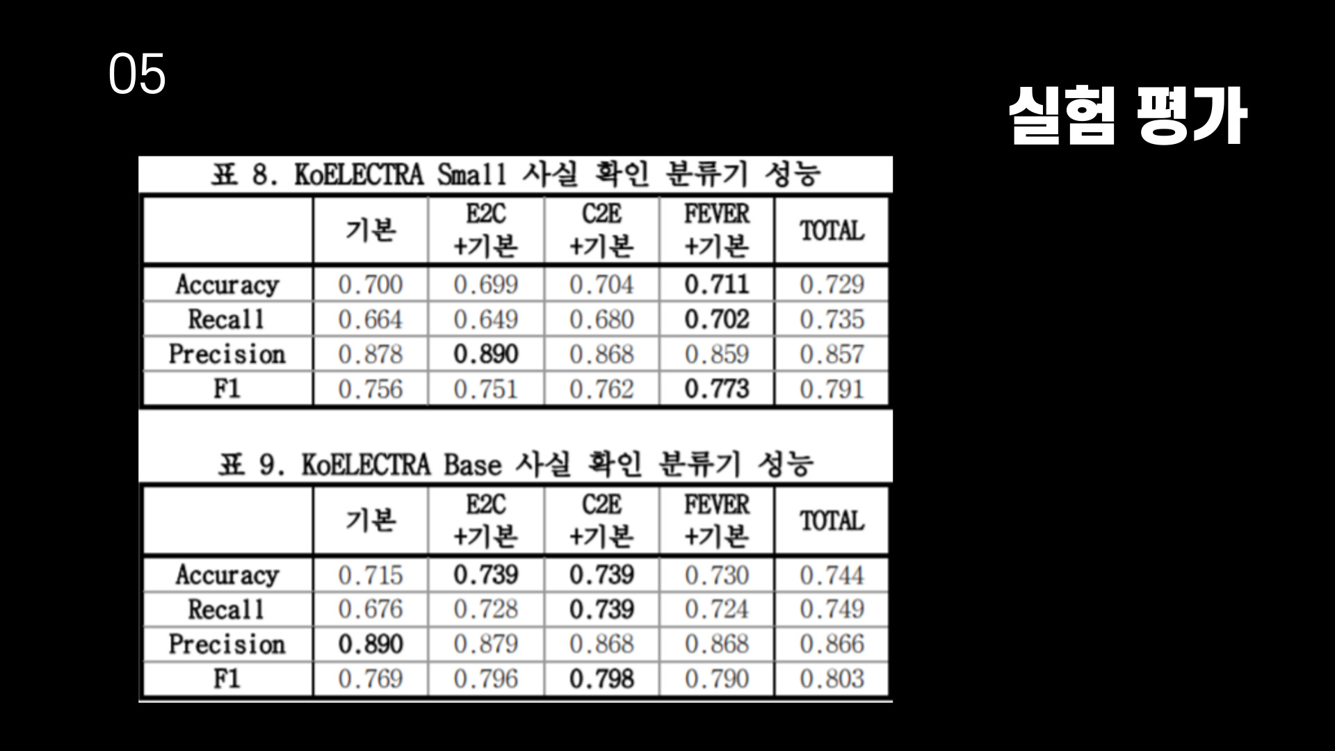 이 논문에서 소개한 학습 자료를 토대로 학습한 KoELECTRA 모델의 평가 결과이다. 두 모델 모두 평가 데이터에서 낮은 Recall과 높은 Precision을 기록하였는데, 이는 평가 자료에서 모델이 Fasle negative를 많이 내놓았음을 의미한다.