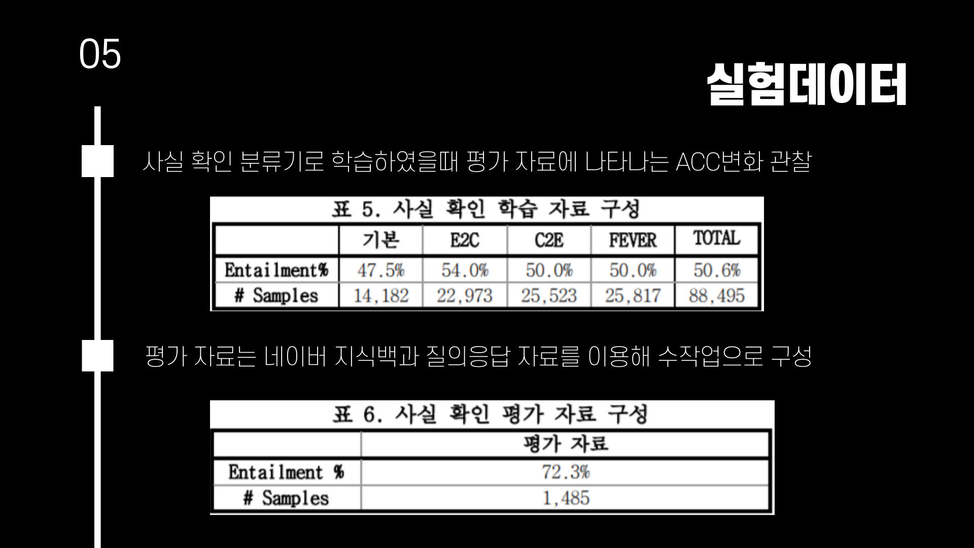 E2C와 C2E 방식으로 구성된 자료의 품질을 평가하기 위해 학습된 모델 성능을 국문 FEVER 번역본에 학습된 모델의 성능과 비교한다. FEVER 학습 자료 예제로는 주장과 근거, 둘 사이의 관계를 나타내는 label(Supported, Refuted, Not Enough Info)이 주어진다. FEVER의 Not Enough Info 예제는 따로 정답인 근거가 주어지지 않기 때문에 제외한다.