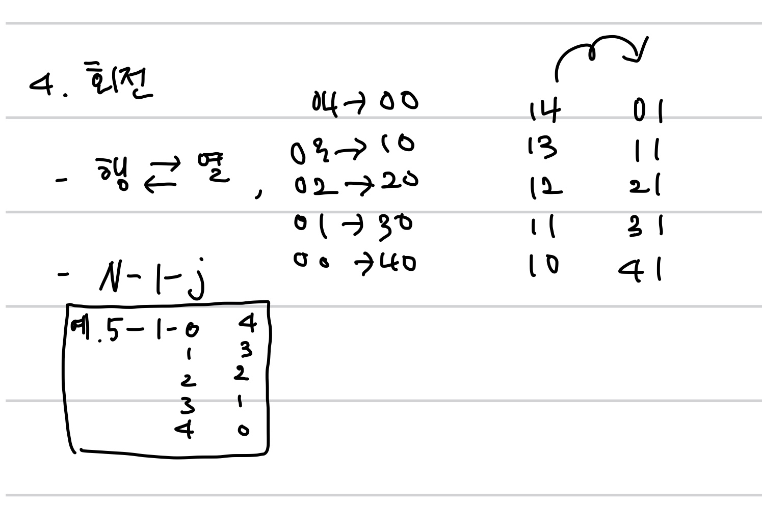 | 반시계 방향 90도 회전 | new_arr[ j ][ n - 1 - i ] = arr[ i ][ j ] |