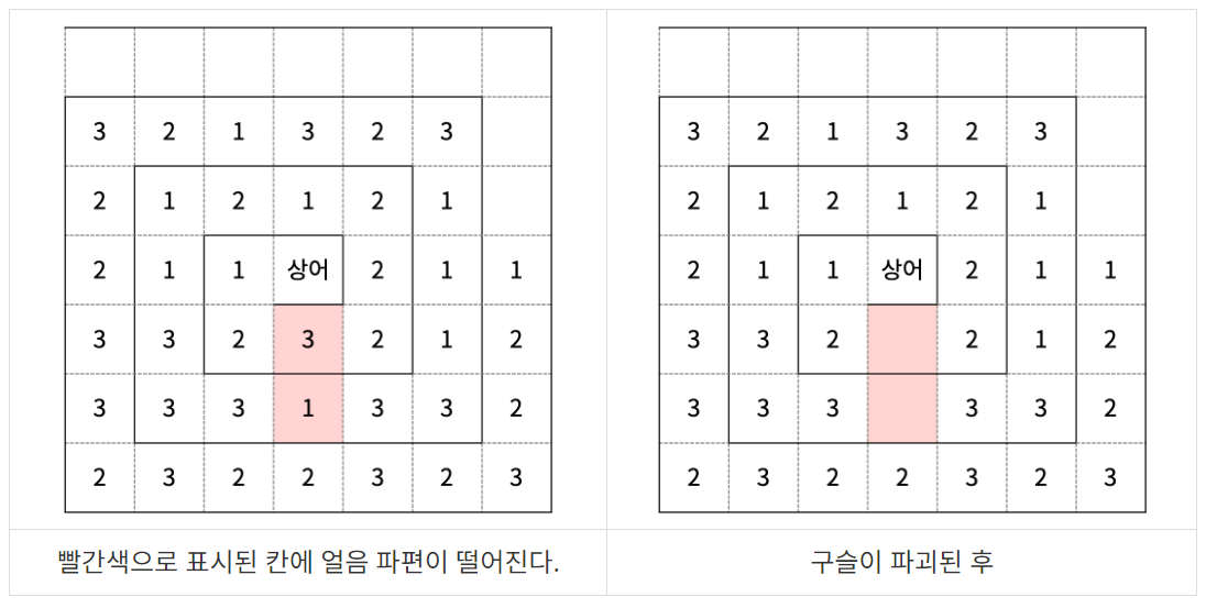 만약 어떤 칸 A의 번호보다 번호가 하나 작은 칸이 빈 칸이면, A에 있는 구슬은 그 빈 칸으로 이동한다. 이 이동은 더 이상 구슬이 이동하지 않을 때까지 반복된다. 따라서, 구슬이 파괴된 후에는 빈 칸이 생겨 구슬이 이동하고, 구슬이 모두 이동한 결과는 다음과 같다.