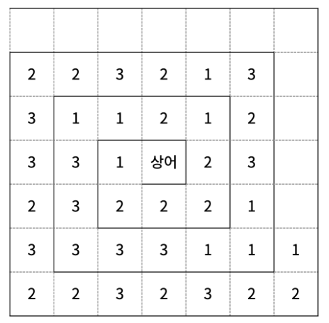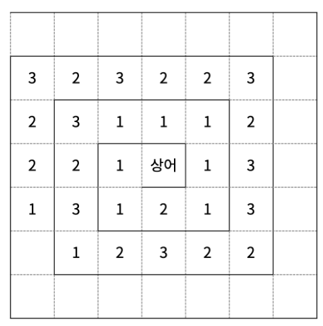 마법사 상어는 파이어볼, 토네이도, 파이어스톰, 비바라기 마법을 할 수 있다. 오늘 새로 배운 마법은 블리자드이고, 크기가 N×N인 격자에서 연습하려고 한다. N은 항상 홀수이고, (r, c)는 격자의 r행 c열을 의미한다. 격자의 가장 왼쪽 윗 칸은 (1, 1)이고, 가장 오른쪽 아랫 칸은 (N, N)이며 마법사 상어는 ((N+1)/2, (N+1)/2)에 있다.
