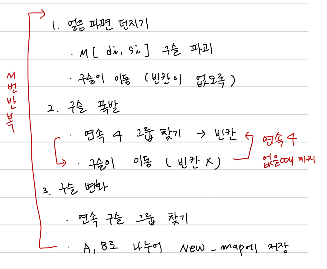 구슬의 폭발은 연속된 4개의 구슬이 없을 때까지 반복해야 하므로, check라는 플래그를 이용해 폭발 수행여부를 저장한다.