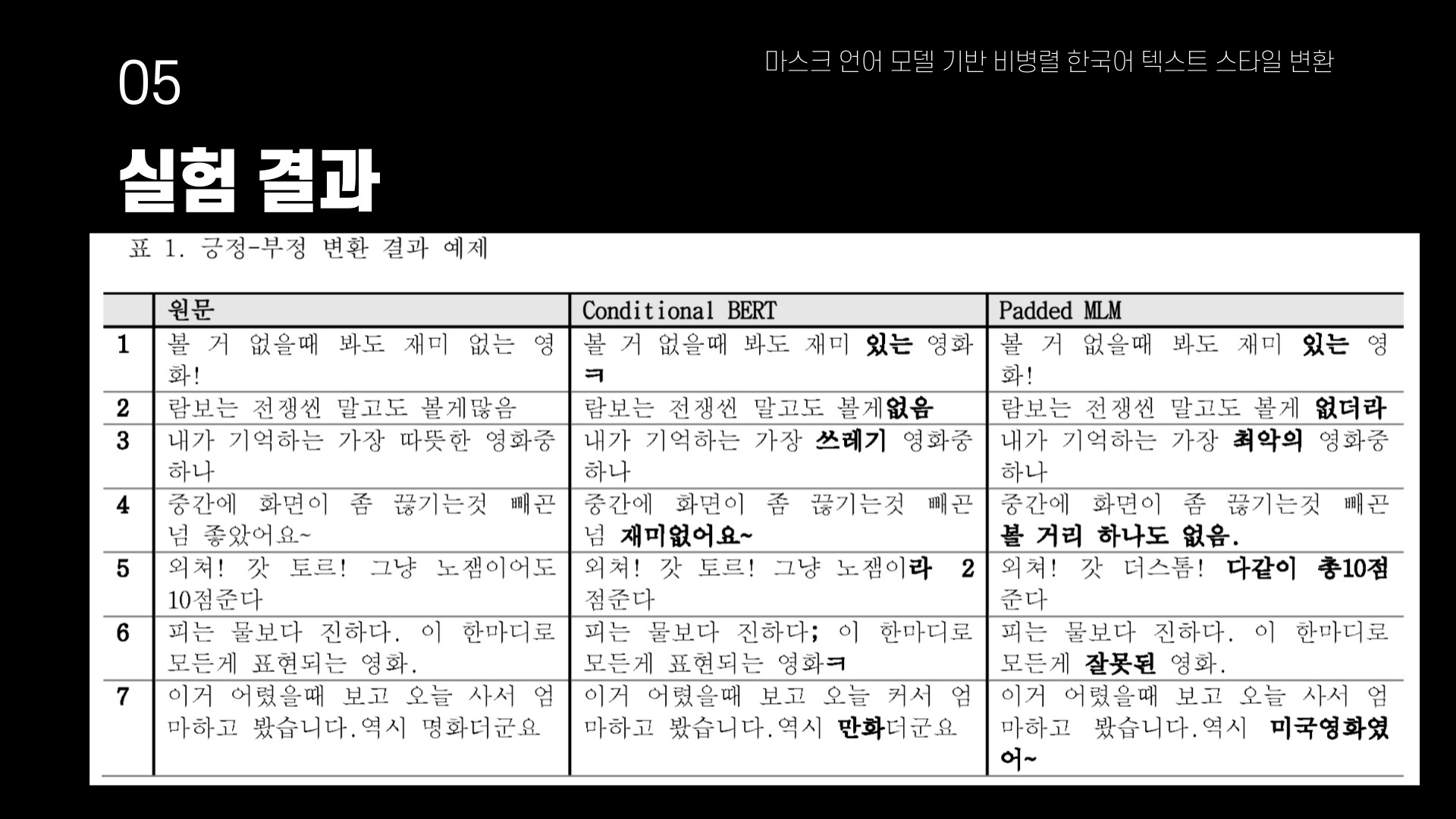 한국어 긍정-부정 데이터로 네이버 영화 리뷰데이터를 사용하였다. 위의 표는 각 모델이 긍정-부정 변환을 수행한 결과이다. 전체 예제에서 '따듯한', '쓰레기', '최악의'와 같이 주로 감성분석 도메인에서 극성을 나타내는 단어를 변경하는 것을 확인 할 수 있따. 1-4번 예제는 스타일 변환이 잘 수행된 결과를 나타내며, 5번은 Padded MLM이, 6번은 Conditional BERT가, 7번은 두 모델 모다가 스타일 변환에 실패한 예제들이다. 4번 예제를 통해 Padded MLM모델이 가변 길이 생성을 통해 Conditional BERT모델 보다 더 풍부하게 단어를 생성할 수 있음을 알 수 있다.