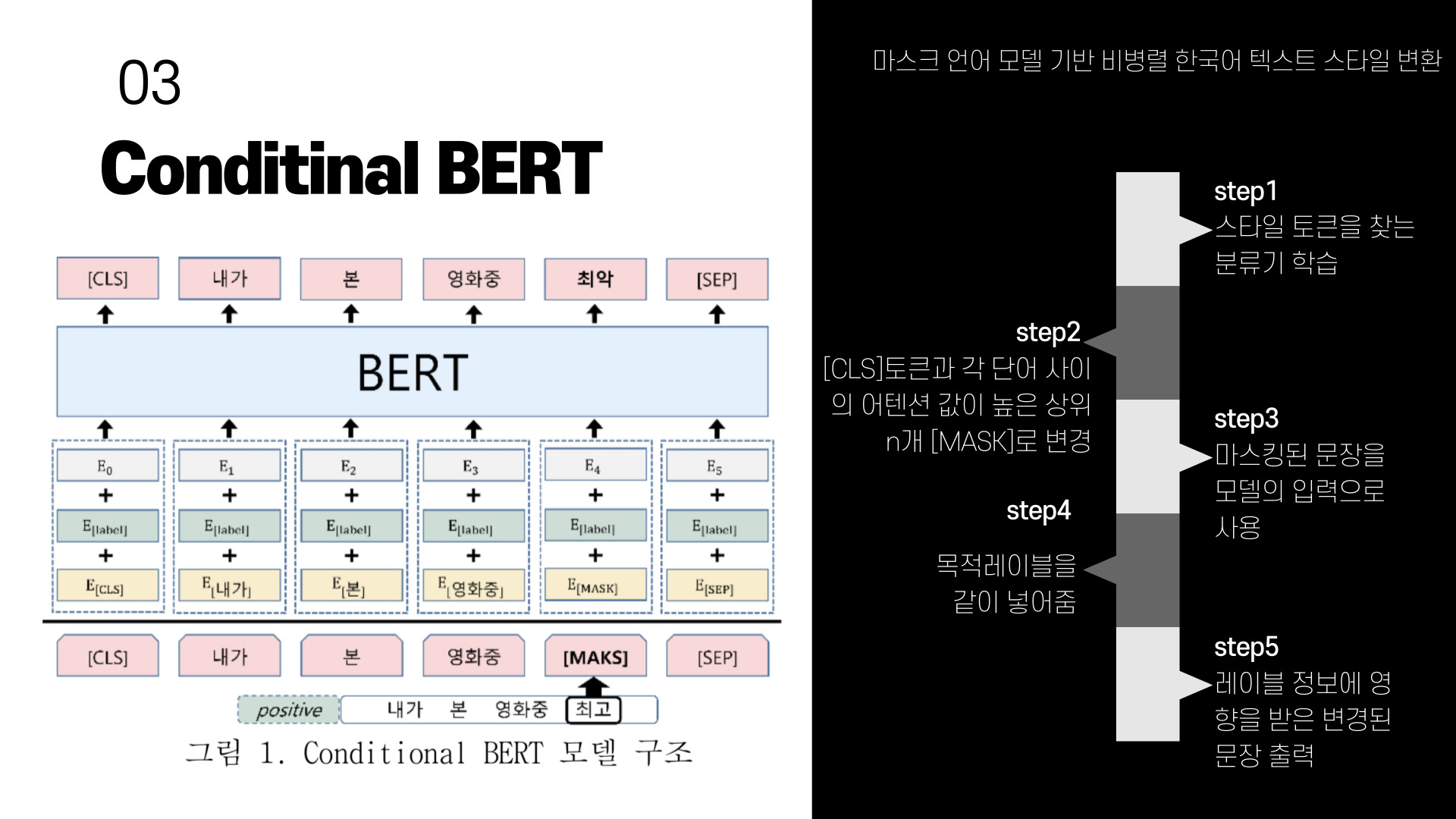 기존 BERT모델에서 마스크된 단어를 생성할 때, 생성되는 단어가 입력된 레이블 정보에 영향을 받도록 설계된 모델이다. 기존의 버트 임베딩이 [Token embedding + Segment embedding + position embedding]이였다면 condititonal 버트 임베딩은 [Token embedding + label embedding + position embedding]으로 표현된다. 모델의 학습은 사전학습된 BERT모델을 레이블의 정보와 스타일 변환에 사용할 도메인 테이터로 미세조정하는 방법을 통해 학습한다.