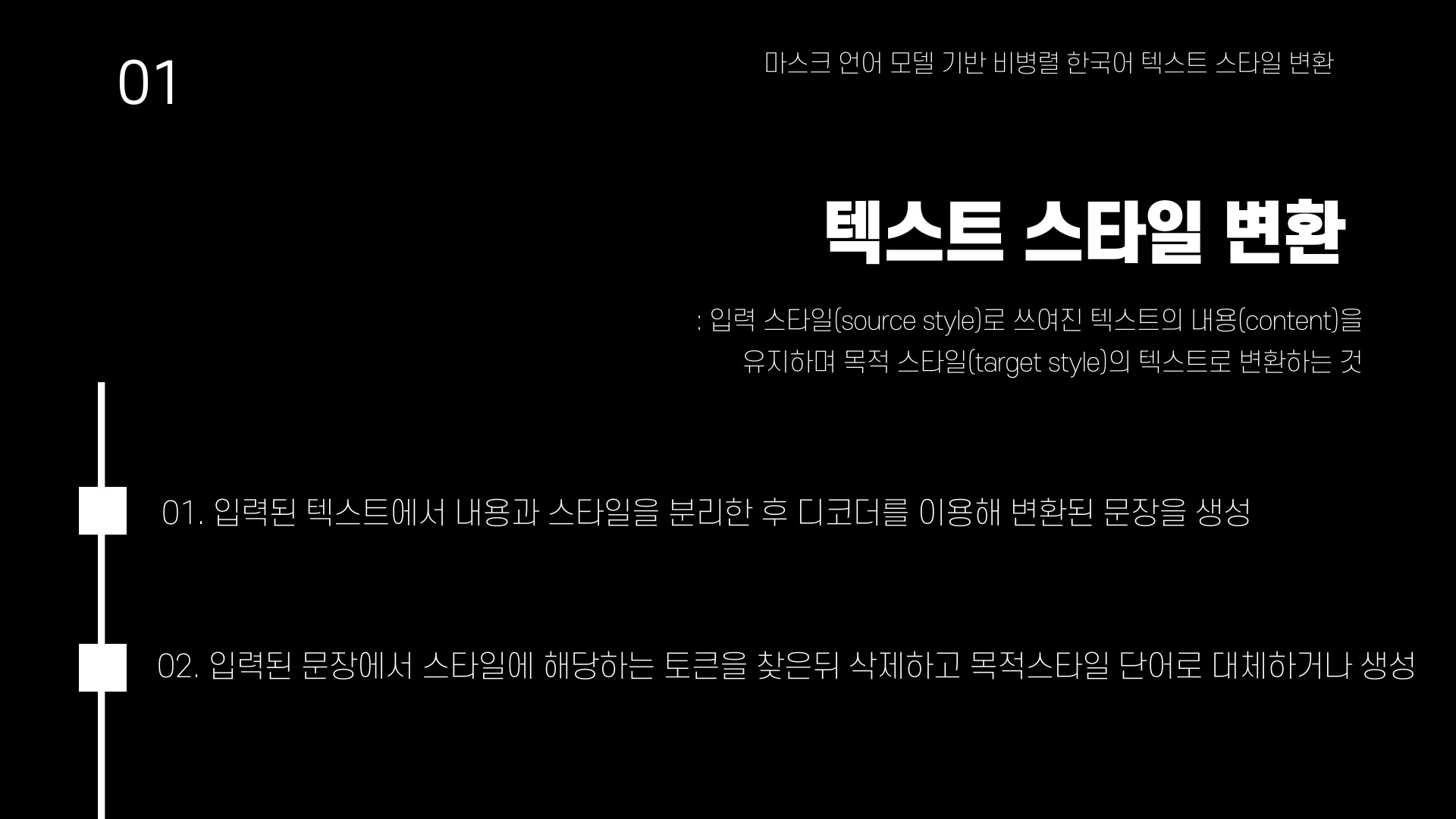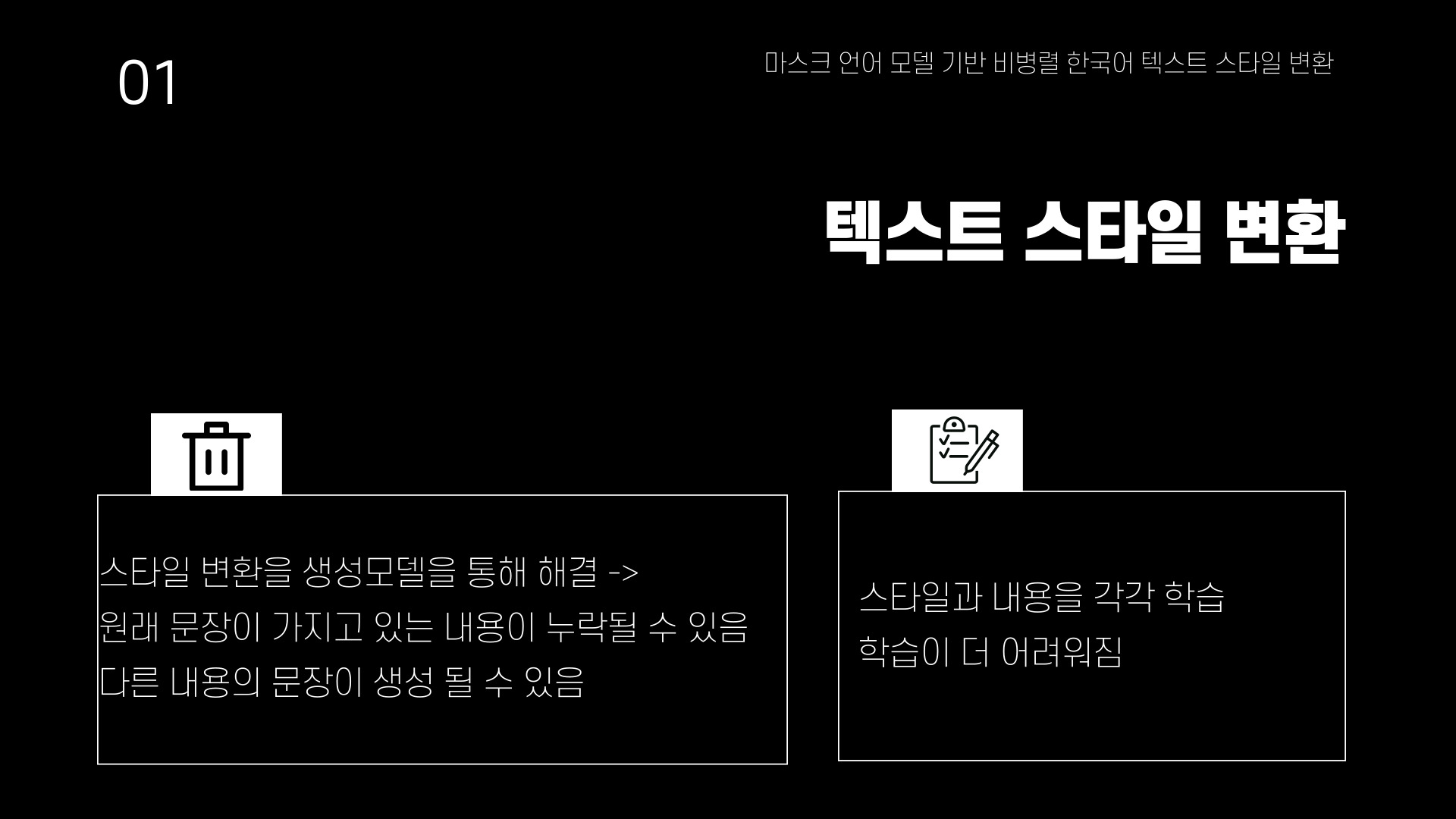 텍스트 스타일 변환(text style transfer)는 입력 스타일(source style)로 쓰여진 텍스트의 내용을 유지하며 목적 스타일(target style)의 텍스트로 변환하는 문제이다. 가장 기본적인 예시로 긍정문으로 쓰여진 문장을 부정적인 문장으로 바꾸는 것, 구어체를 문어체로 바꾸는 것 등이 있을 수 있겠다. 비병렬 말뭉치를 이용한 텍스트 스타일 변환 연구는 적대적 학습을 통해 입력된 텍스트 에서 내용과 스타일을 분리한 후 디코더를 이용해 변환된 문장을 생성하는 방법과, 입력된 문장에서 스타엘에 해당하는 토큰을 찾은뒤 삭제한 후 이를 목적스타일의 단어로 대체하거나 생성하는 방법이 있다.