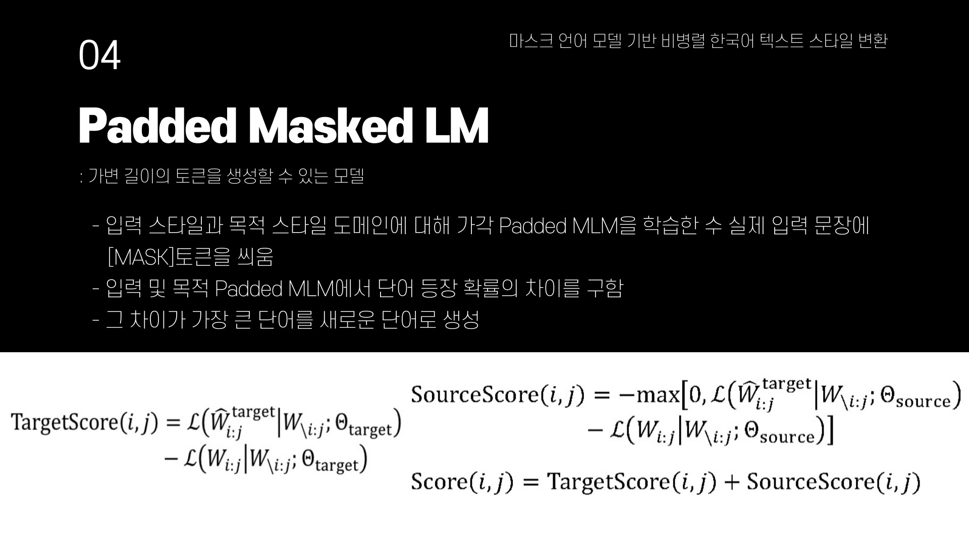 두번째 모델인 Padded Masked LM은 N개의 마스크된 토큰을 N개의 토큰으로 생성하는 기존 BERT모델과 달리 가변길이의 토큰을 생성할 수 있는 모델이다. Padded MLM을 학습하기 위해 입력 문장에 고정된 np개의 마스크를 씌운다. i:j개의 토큰을 정답으로, j+1:i+np-1개의 토큰을 [PAD]토큰으로 학습하게 된다. 앞서 설명한 모델과 달리 스타일 토큰을 삭제하기 위한 분류기는 사용하지 않았으며, 입력스타일과 목적스타일 도메인에 대해 각각 Padded MLM을 학습한 후 실제 입력 문장에 마스크 토큰을 씌우는 방식을 사용한다. 입력 및 목적 Padded MLM에서 단어 등장 확률의 차이를 구하고, 그 차이가 가장 큰 단어를 새로운 단어로 생성하는 방법을 사용한다. targetWij는 목적 Padded MLM으로 생성한 단어를 나타내고, Wij는 실제 입력된 단어를 나타낸다. 최종 스코어는 타겟스코어와 소스 스코어를 합하여 나타내다.