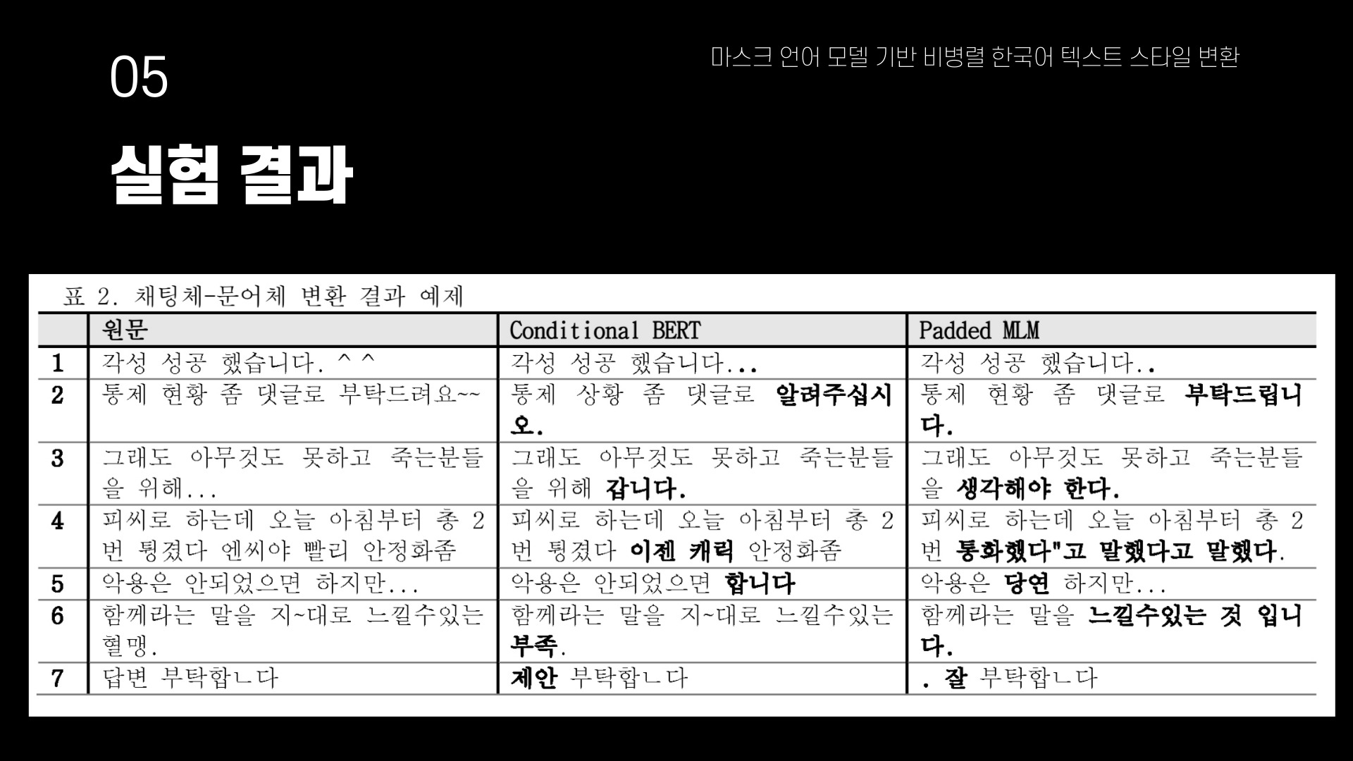 채팅체-문어체 비병렬 변환에는 직접 수집한 데이터를 사용하였다. 문어체는 뉴스 기사로 가정하여 네이버 뉴스기사를 크롤링한 약 50만 문장을 사용하였고 채팅체는 게임 게시판에 게시된 글로 가정하여 엔씨소프트 리니지2M게시판에서 크롤링한 약 50만 문장을 사용하였다. 1번 예제는 채팅체에서 사용된 이모티콘이 마침표로 변환되어 출력된 것을 잘 보여준다. 2번 예제의 경우 Padded MLM은 완벽하게 변환을 성공하였고, Conditional BERT는 '알려주십시오.'로 변환하였지만, 입력 문장의 내용을 유지하고 있음을 보여준다. 3번 예제에서 Padded MLM이 생성한 문장을 보면 문어체로 가정한 뉴스 도메인에서 사용하는 문장을 그대로 가져 온 것을 볼 수 있다. 6번 예제에서 Conditional BERT 모델이 '혈맹.'을 '부족'으로 변환하였는데 단어 수준에서는 도메인의 내용을 잘 변경한 것으로 보이지만 원래의 내용을 보존하기 위해 마스킹에 제한을 두어 문어체로의 변환은 이루어지지 않을 것을 보여준다.