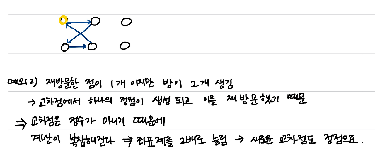 그럼 교차점을 새로운 정점으로 생각하여 재방문한 정점으로 계산 할 수 있음!