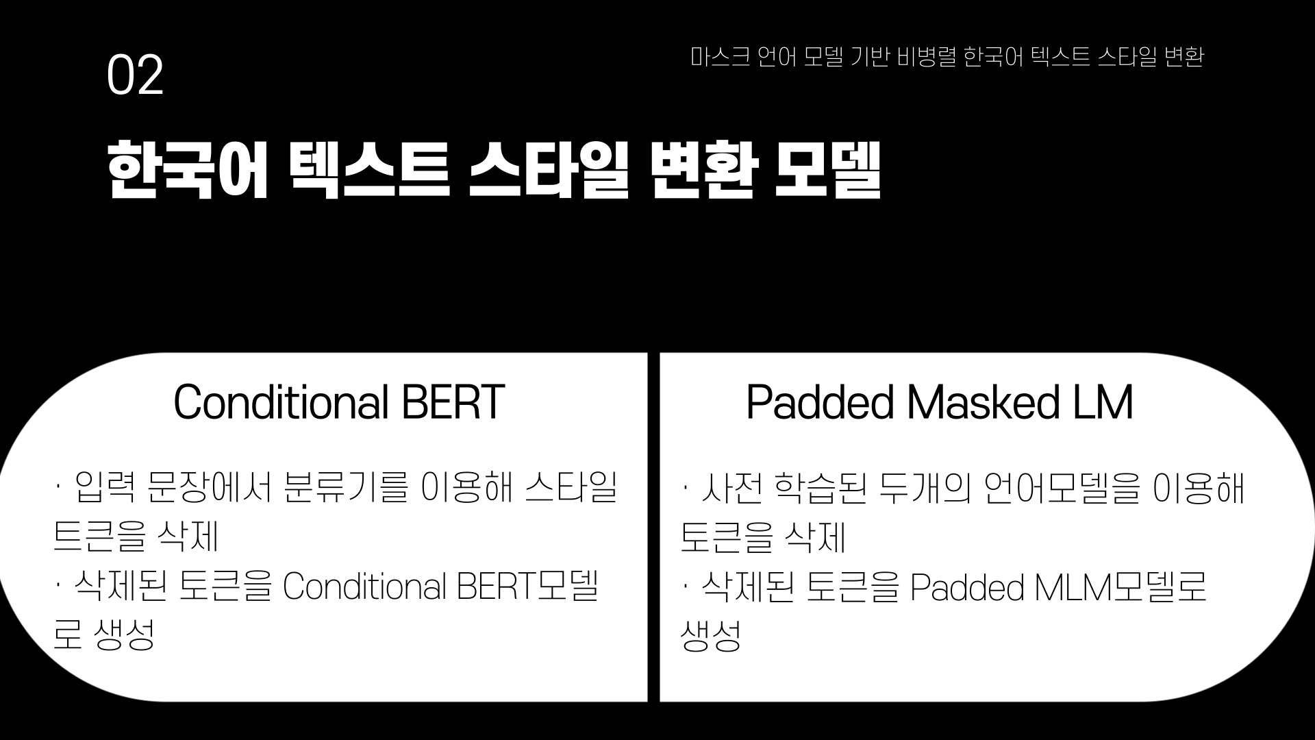 마스크 언어 모델 기반 비병렬 한국어 텍스트 스타일 변환 : 배장성, 이창기, 황정인, 노형종(강원대학교 컴퓨터 과학과, 엔씨소프트 NLP Center Language AI Lab)